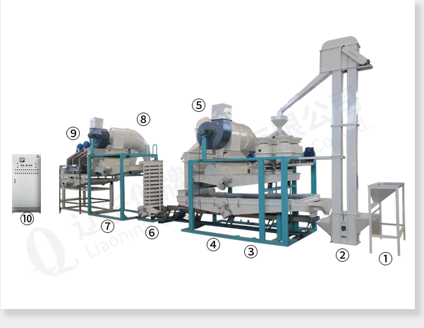 ① input hopper ② bucket elevator ③ main part of the equipment(dehuller,air separator and seed-kernel separator) ④ leaf-spring conveyor ⑤ vertical air-separating system ⑥ spiral elevator ⑦ vibrating air-separator ⑧ vertical air-separating system ⑨ electrostatic air separator ⑩ electric control cabinet