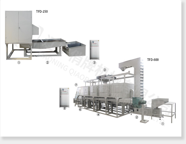 TFD-600型:① 上料(liao)斗 ② Z型提(ti)升機 ③ 喂(wei)料小車(che) ④ 脫皮機(4臺) ⑤ 送料篩(2臺) ⑥ 除糠篩(shai)和分選篩(shai) ⑦ 排塵(chen)系統 ⑧ 電氣控(kong)制柜