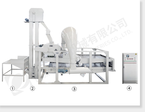 ① 上(shang)料斗② 斗式提升機 ③ 脫殼、風選(xuan)、分選(xuan)主機 ④ 電氣控制(zhi)柜