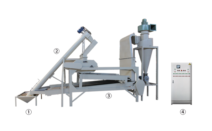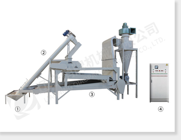 ① 上料(liao)斗 ② 絞(jiao)龍螺旋輸送機 ③ 脫殼、風選、分(fen)選主機(ji) ④ 電氣控制柜
