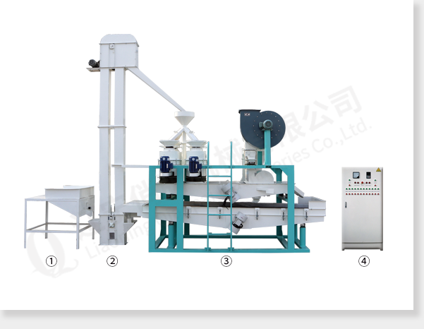 ① 上料斗② 斗式提(ti)升機(ji) ③ 脫殼(ke)、風選、分選主機 ④ 電氣(qi)控制柜